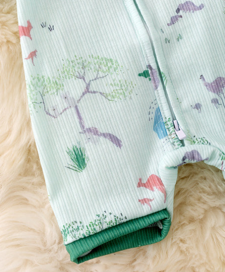 This Outback Adventure Infant's 1 Piece Romper boasts a variety of shades of green, made from a textured fabric. The front closure is a convenient zipper and features playful outback animals like kangaroos, alligators, anteaters, and ostriches.