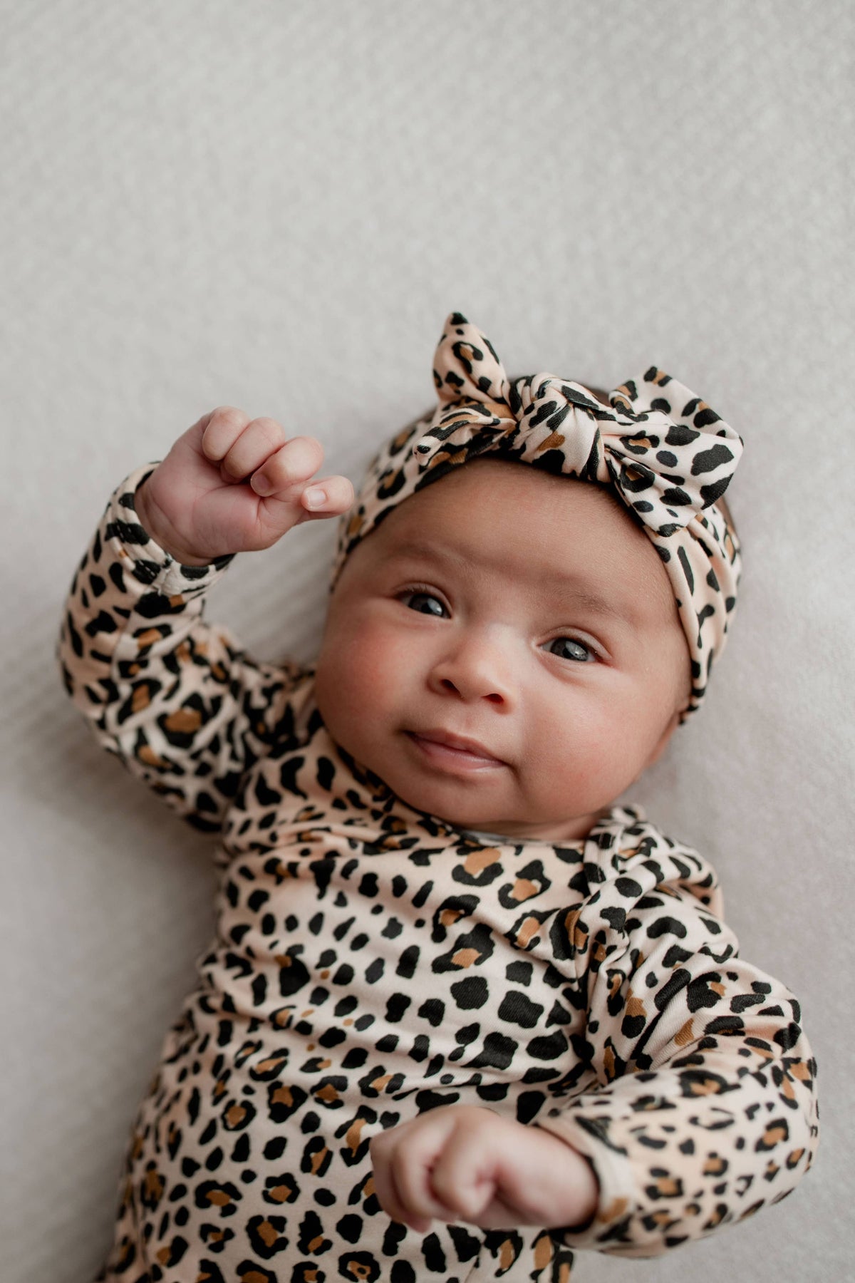 Our Leopard Print Knotted Soft Gown will make your baby feel like they're wrapped in a cloud! The fabric is ultra-soft, stretchy, and designed for ultimate comfort. The tie bottom allows for effortless diaper changes, while the fold-over hand mitts protect your baby's delicate skin. With convenient pull-down tabs at the shoulder, dressing and changing will be a breeze. This size is perfect for newborns to 3 months old, weighing between 5 to 15 pounds. *GOWN ONLY: HAT/BOW NOT INCLUDED*