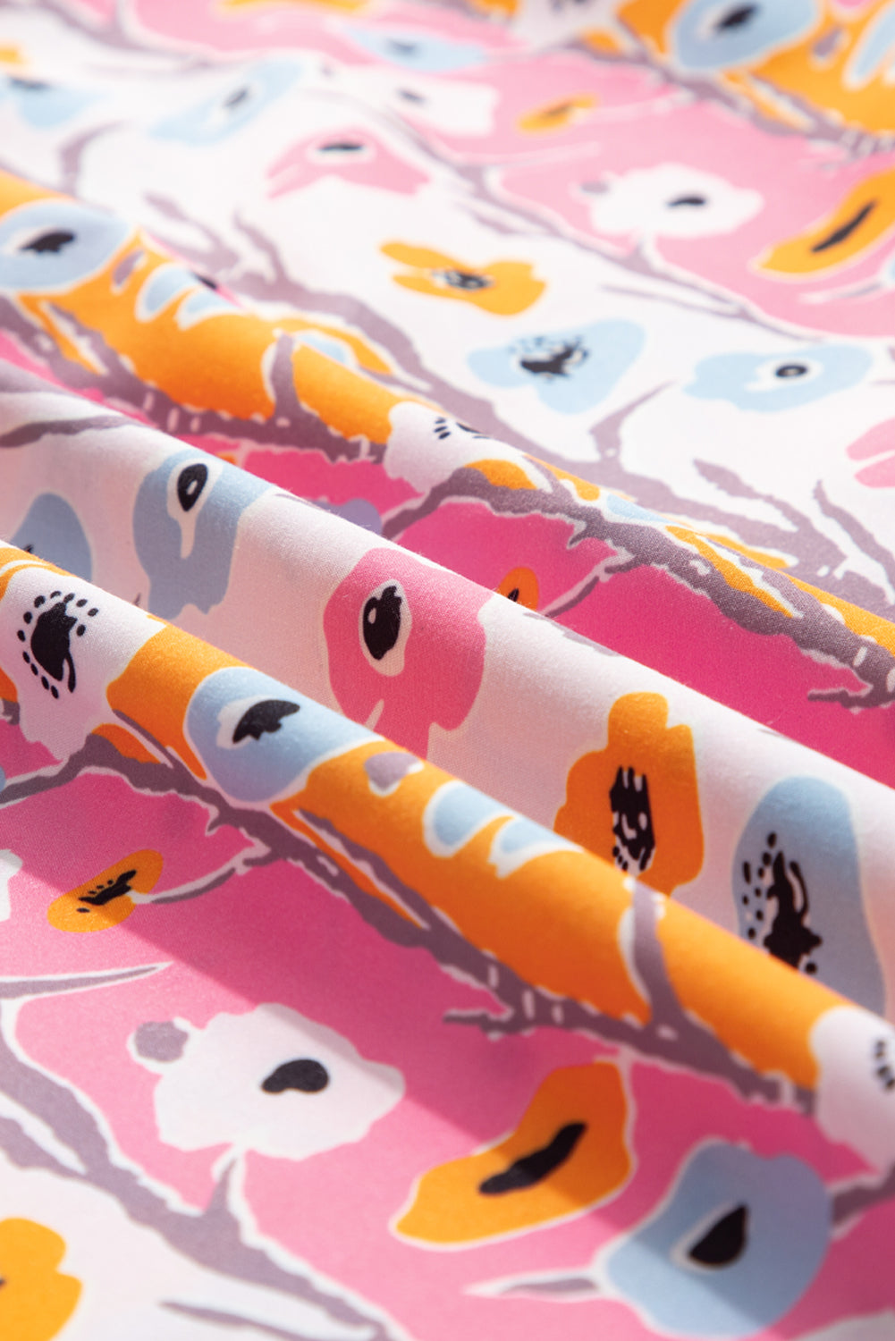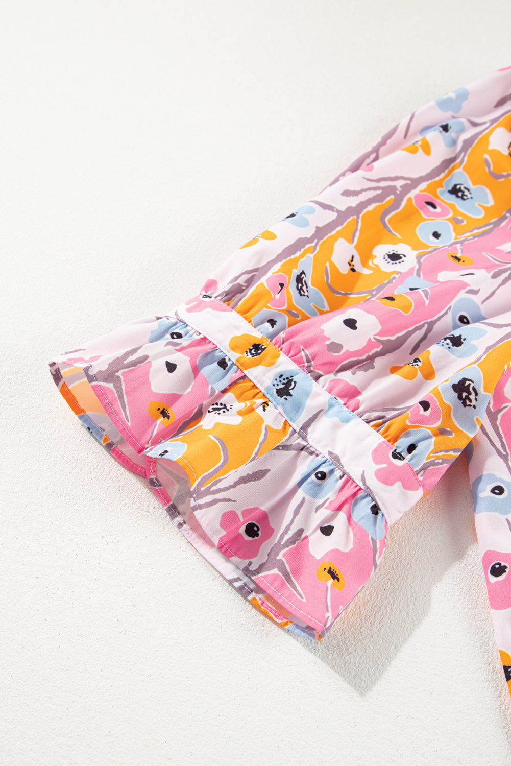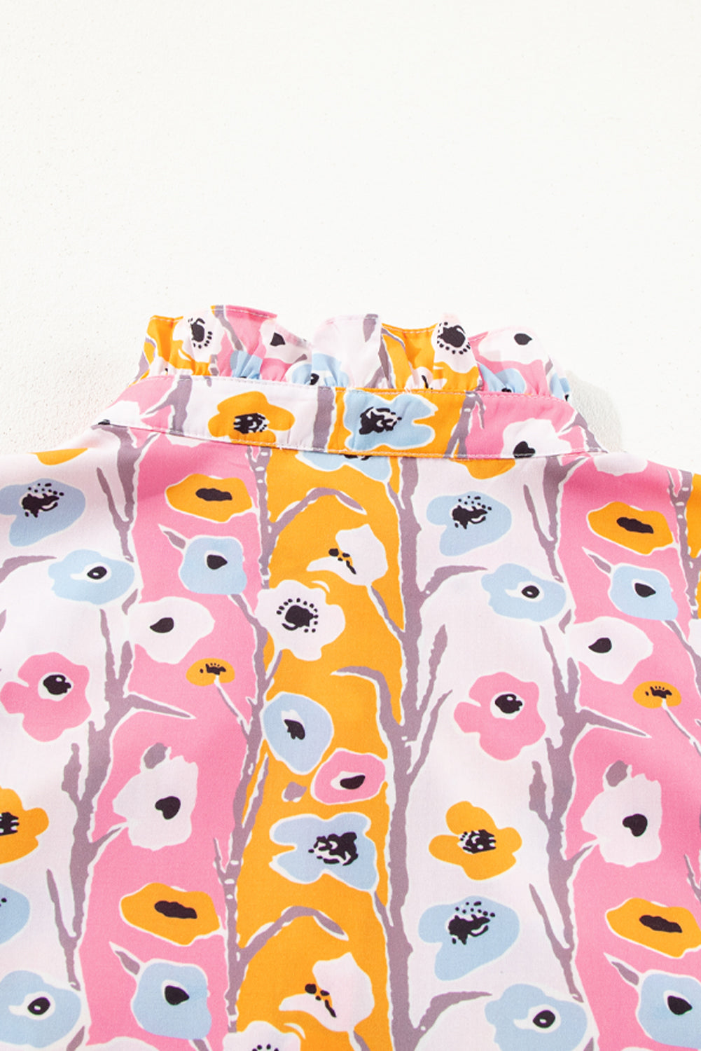 Meet the instant-outfit top that turns heads and lifts moods. A painterly floral in sunset pinks and marigold meets a soft ruffled mock neck and fluttery ¾ sleeves for an effortlessly polished look—no styling degree required. ✨