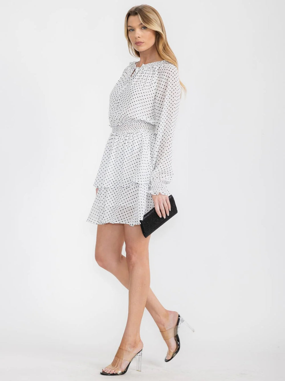 Macaron Swiss Dot Ruffle Neck Mini Dress β White with Black Polka Dots